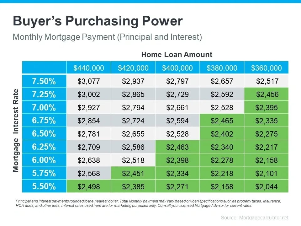 To grasp the significance of this rate shift, it's essential to understand how mortgage rates influence your monthly home payments. The chart below illustrates the correlation between mortgage rates and your ability to afford a home. Imagine having a budget that allows for a monthly payment between $2,400 and $2,500. The green section in the chart represents payments within or below this range, showcasing the impact of varying rates on your budget and loan affordability.