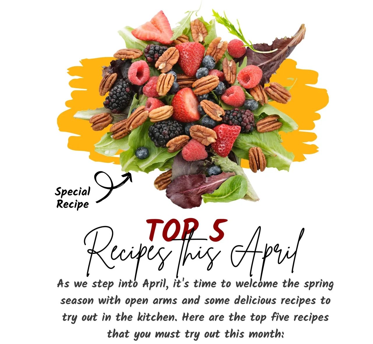 These are the top five recipes that you must try out this April. Whether you're looking for a light and fresh salad or a hearty bowl of soup, these recipes have got you covered. Happy cooking!